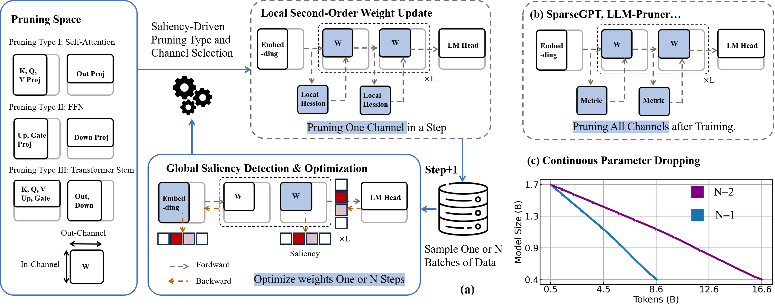methods like SparseGPT or LLM-Pruner (shown in part b),